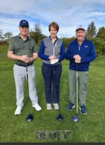 Pictured above is L R. Kevin McKenna Carrick Golf Club Angela O’Sullivan Dun Laoghaire G.C. P.G.A Professional Damien McGrane Carlow Golf Club at the start of the All Ireland P.G.A Final in Druids Heath Golf club on Friday the 10th of October.