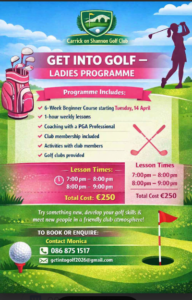 The programme for the Ladies get into Golf starts on Tuesday 14 th of April. One Hour weekly lessons. Coaching with a P.G.A. Professional. Club membership included. Activities with club members. Golf clubs provided. Lessons time’s 7.00pm to 8.oopm and 8.00pm to 9.00pm. [image: image.png]